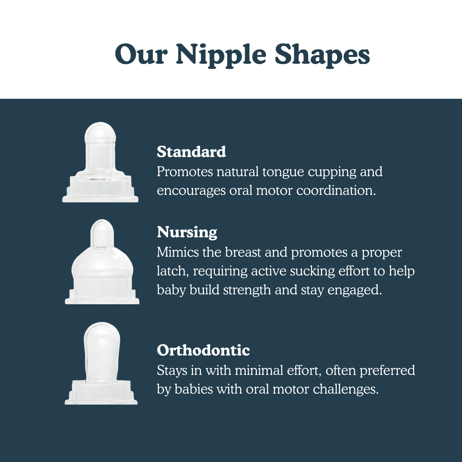 No two babies are the same. Instead of wasting money on dozens of pacifiers, our 3-in-1 Starter Kit gives you three safe nipple shapes in one system—so your baby can lead the way.